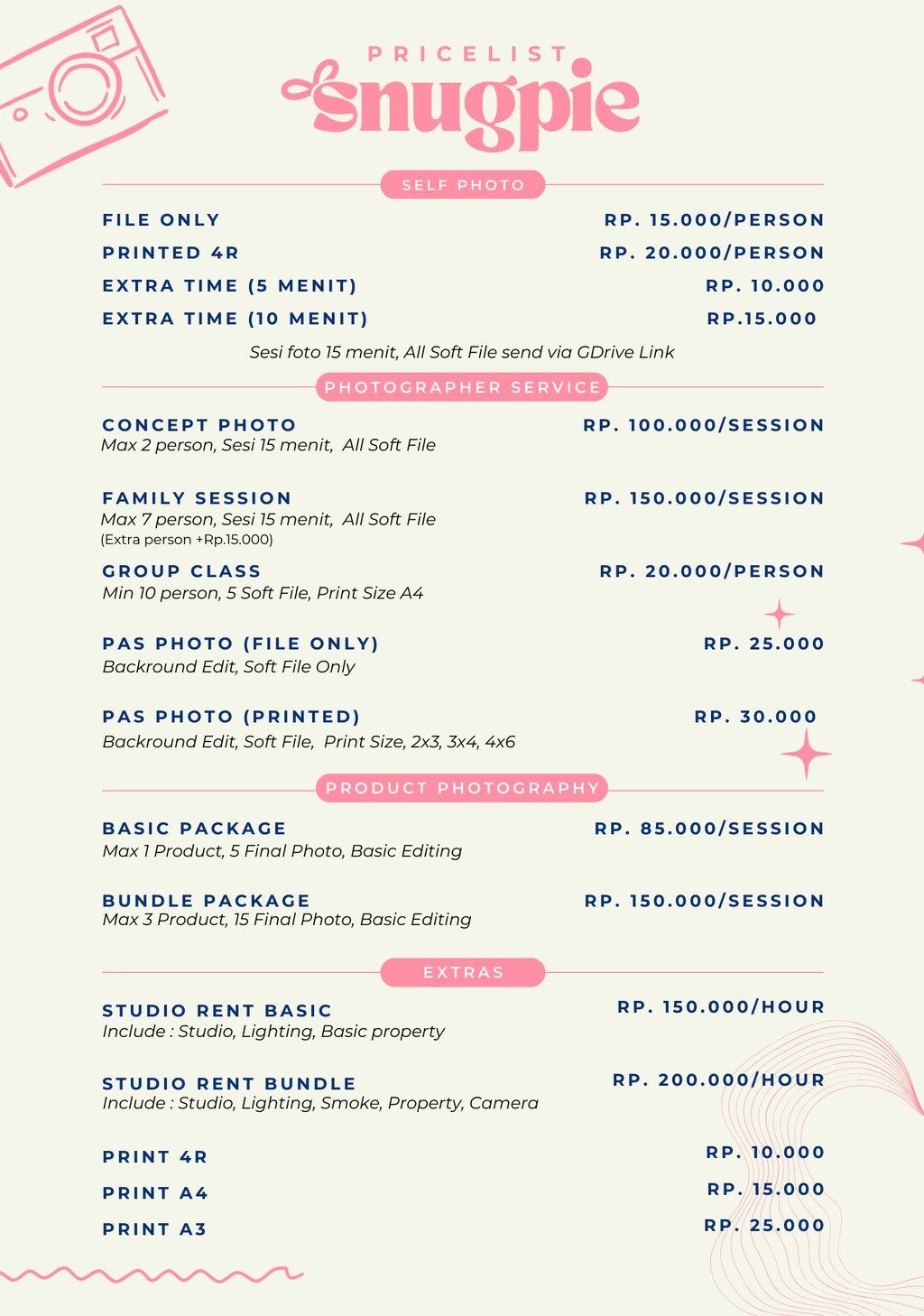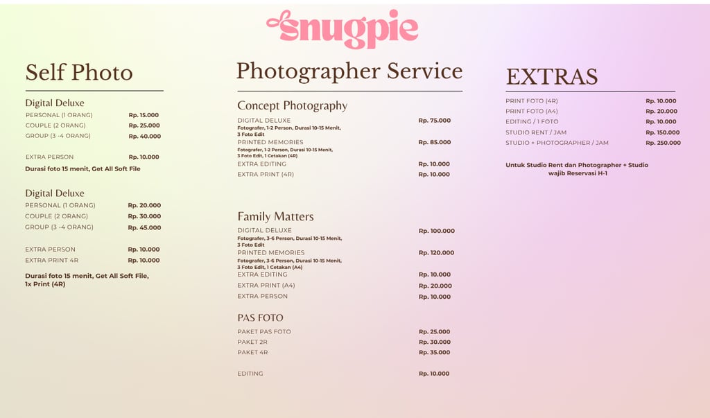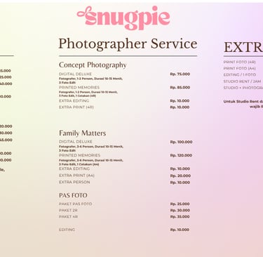 Untuk kamu yang ingin hasil foto lebih terarah, Snugpie Studio menyediakan layanan Photographer Service, difoto langsung oleh fotografer profesional kami.